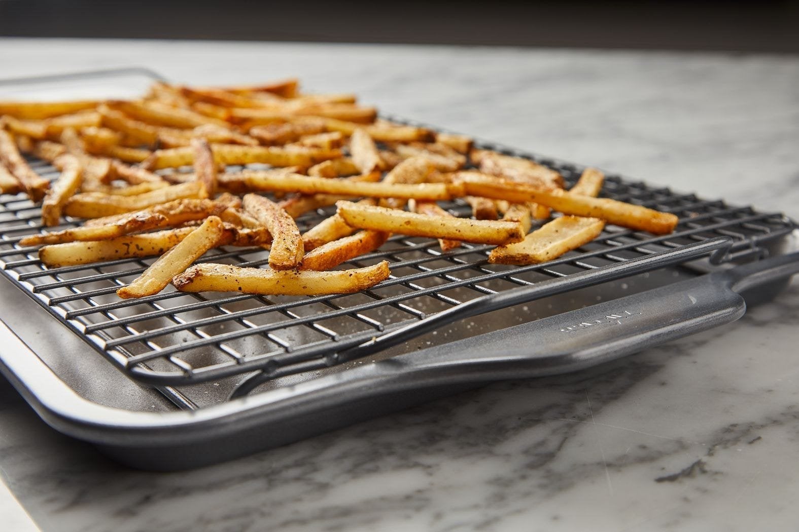 Thick-gauge aluminized steel heats evenly, resists warping, and is oven-safe 450° F.
