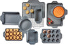Bake striking layer cakes, decadent breads, and perfect pinwheels with this 10-Piece set. Essential pieces for the passionate baker, this set includes Half Sheet Pan with Cooling & Baking Rack, Cookie Sheet, 12-well Muffin Pan, two Round Cake Pans, Rectangular Baking Pan, Square Baking Pan, Quarter Sheet Pan and 1-lb. Loaf Pan. Oversized handles allow for a safe grip of the pan, even while wearing mitts, while the half sheet pan's convenient third handle allows easy removal of the hot pan from the oven, without accidentally dipping a thumb in the freshly baked goods. The durable ceramic-reinforced PFOA-free nonstick finish is specially designed for baking, releasing moist cakes, gooey cookies, and sticky treats with ease, batch after batch.