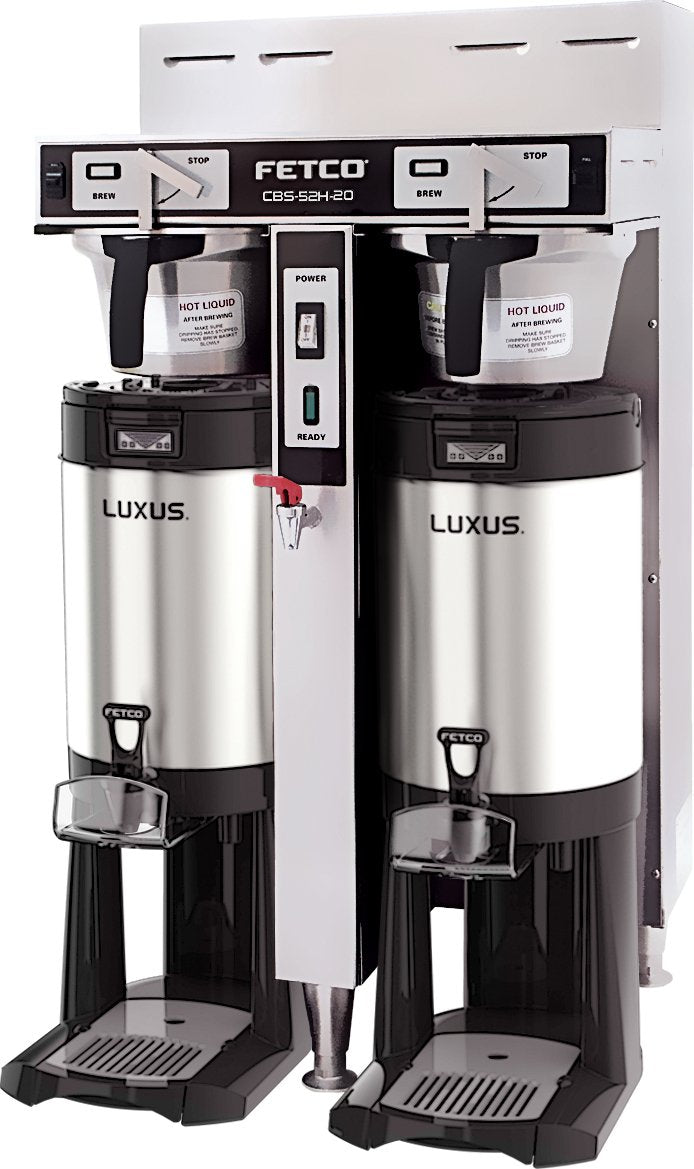 Brew directly into 2 gallon LUXUS Thermal Dispensers for high-volume beverage needs. The CBS-52H-20 features dual brew basket locks incorporated into the start switch, spray-over volume consistency and a patented dispense tube system that resists lime build-up.