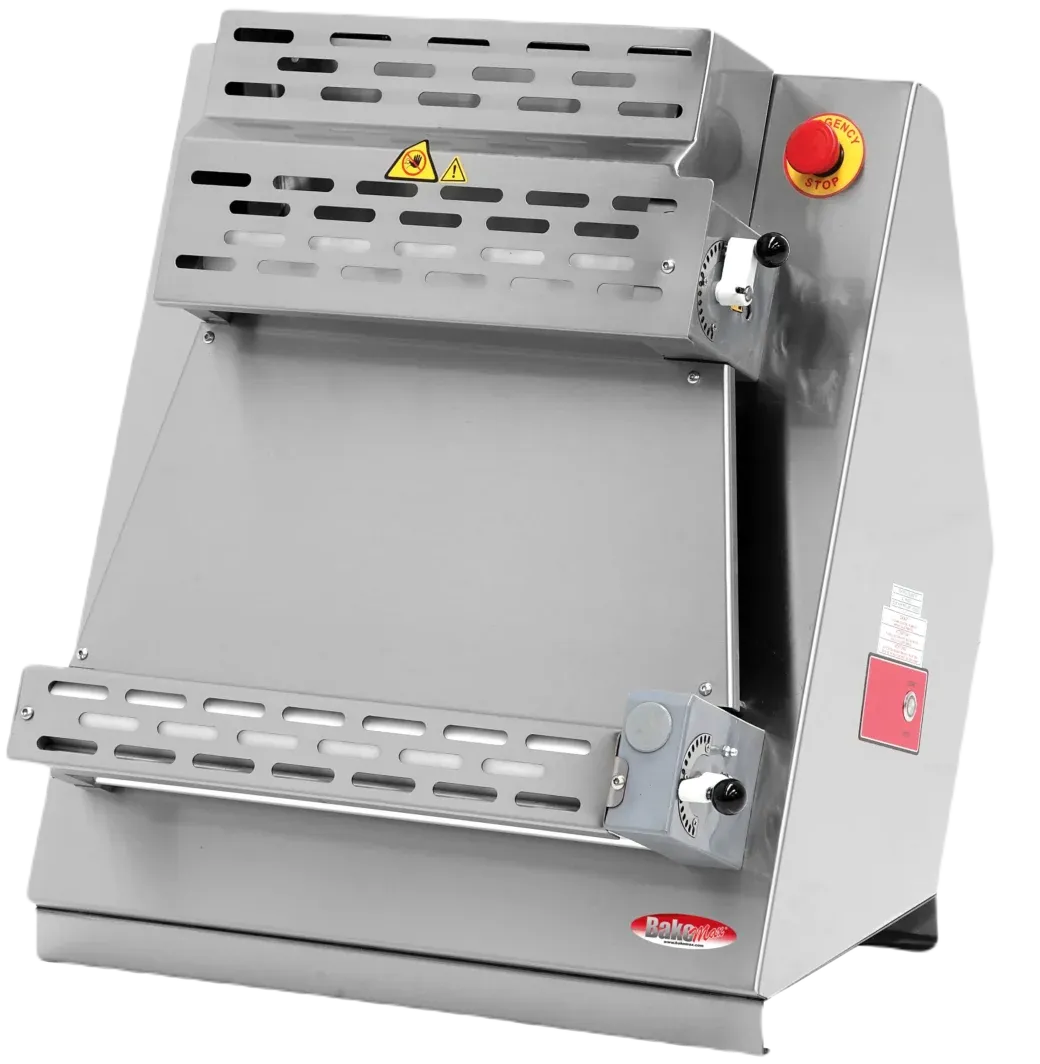 The BakeMax BMHA02Y features a 12-inch capacity, allowing it to process up to 400 pieces per hour. Its two-pass sheeting system ensures uniform thickness and texture, essential for products like pizza bases, pie crusts, and flatbreads. Constructed entirely from stainless steel, including roller guards, the sheeter offers durability and ease of cleaning. The inclusion of two sets of non-stick Delrin roller assemblies facilitates smooth operation and prevents dough from sticking. An emergency stop button enhances safety, while the adjustable dough thickness feature allows for customization between 0mm and 4.76mm. Its compact countertop design, combined with a standard NEMA 5-15P plug, ensures easy integration into various kitchen setups.