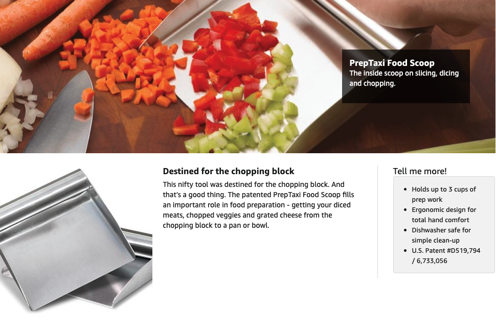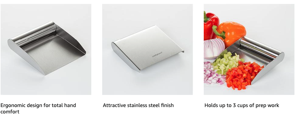 This nifty stainless steel tool was destined for the chopping block. And that’s a good thing. The patented PrepTaxi Food Scoop fills an important role in food preparation - getting your diced meats, chopped veggies and grated cheese from the chopping block to a pan or bowl. Just scoop and transfer. The sides prevent spillage. It’s fast, efficient and a must-have for any cook.