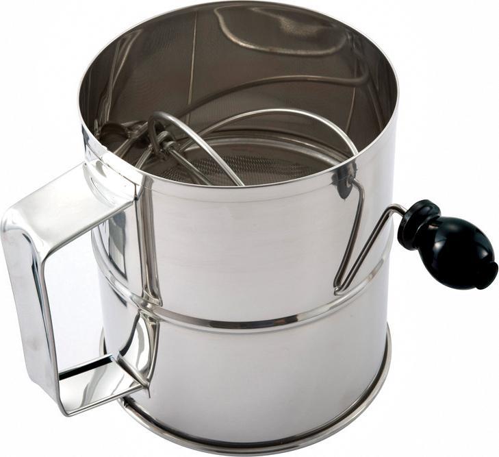 This rotary sifter is made of professional stainless steel. It features an 8 cup capacity with wire mesh reinforcement.