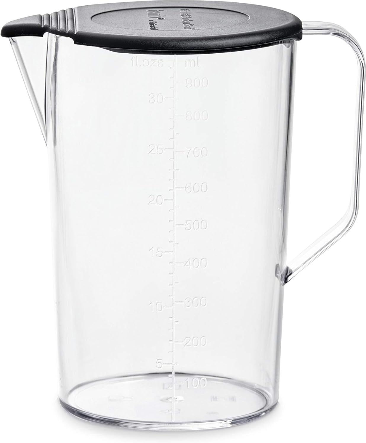 The Bamix® 1L Jug is a versatile kitchen accessory designed for use with your Bamix immersion blender. With its snap-on lid, this jug allows you to blend and store in the same container. Made from food-grade material, the jug is not only shatter-proof but also heat resistant up to 150°C, making it perfect for all your blending and storage needs. It's dishwasher safe, freezer safe, and can even be used in the microwave. This practical jug also features a precision-pour spout and measuring scale markings, making it both easy to use and clean.