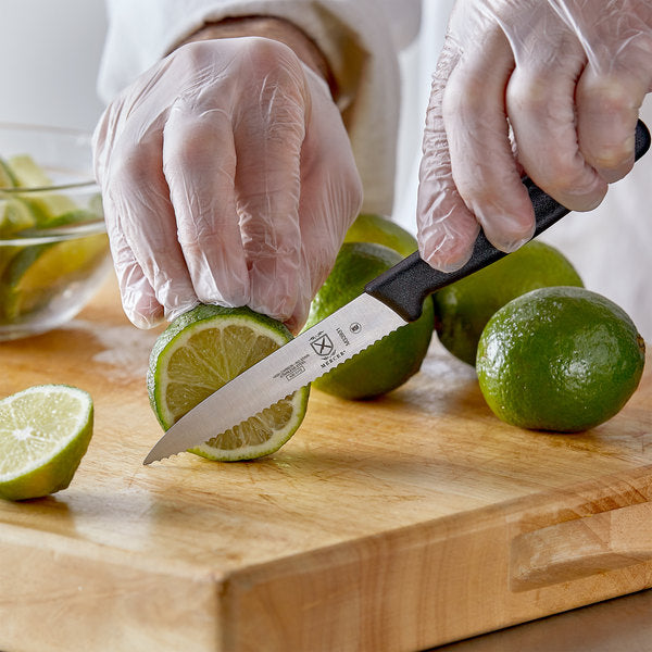 Use this Mercer Culinary 4" serrated pointed tip paring/bar knife with a guard to create the perfect garnish for your crafted cocktail! The perfect addition to any mixologist's toolbox, this knife is designed to effortlessly cut fruits, herbs, and vegetables for garnishing a Bloody Mary, Moscow mule, daiquiri, or your signature drink. Its pointed tip allows you to pierce through thick crusts or skins with ease and the serrated edge is perfect for cutting through tough skins. Use it in your restaurant to cut apples or oranges, or in advance of catered events to prepare strawberries or lemon wedges.
