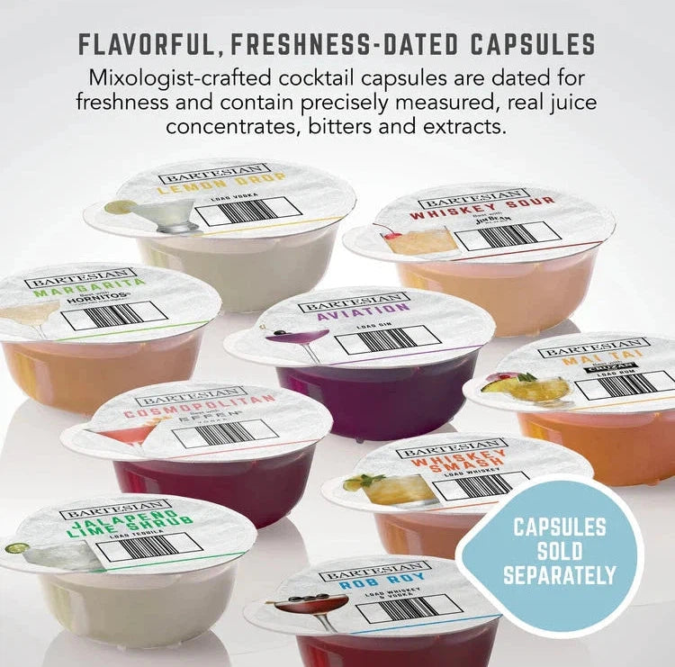 • Premium Cocktail Capsules: Compatible with Bartesian's recyclable capsules, which contain real juice concentrates, bitters, and extracts, delivering bar-quality cocktails in seconds.