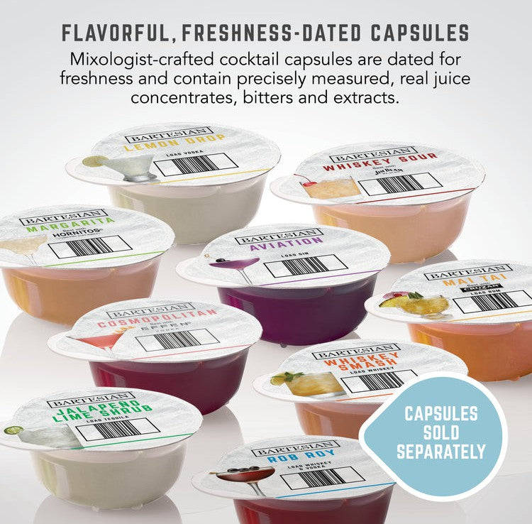 The recyclable capsules contain all the ingredients you need to create a great-tasting cocktail and are even dated for freshness. You can count on real juice concentrates, bitters and extracts. Capsules are sold separately.