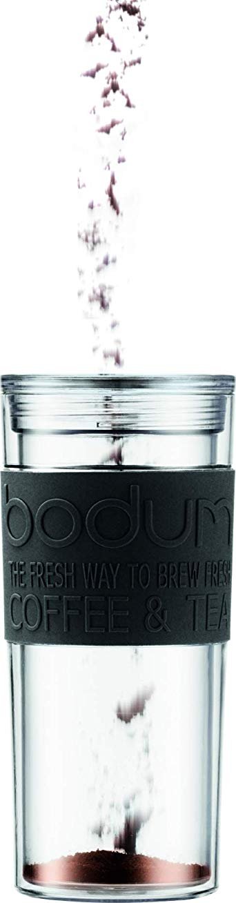 Enjoy a single-serving of French Press coffee or loose leaf tea on the go with Bodum's Travel French Press. Brew and drink or use in the place of a traditional 3 cup French Press. The silicone and mesh filter reduces sediment. To use: add 3-4 tablespoons coarse ground coffee, preferred milk and sweetener, and hot water to the mug. Stir contents, replace lid with plunger up, and go. After 4 minutes press down the plunger and enjoy! The stainless steel double wall design with a vacuum seal maintains heat for hours while remaining cool to the touch. Caution: Please do always keep the mug upright. Due to safety reason, the mug is not leakproof because of possible over pressure.
