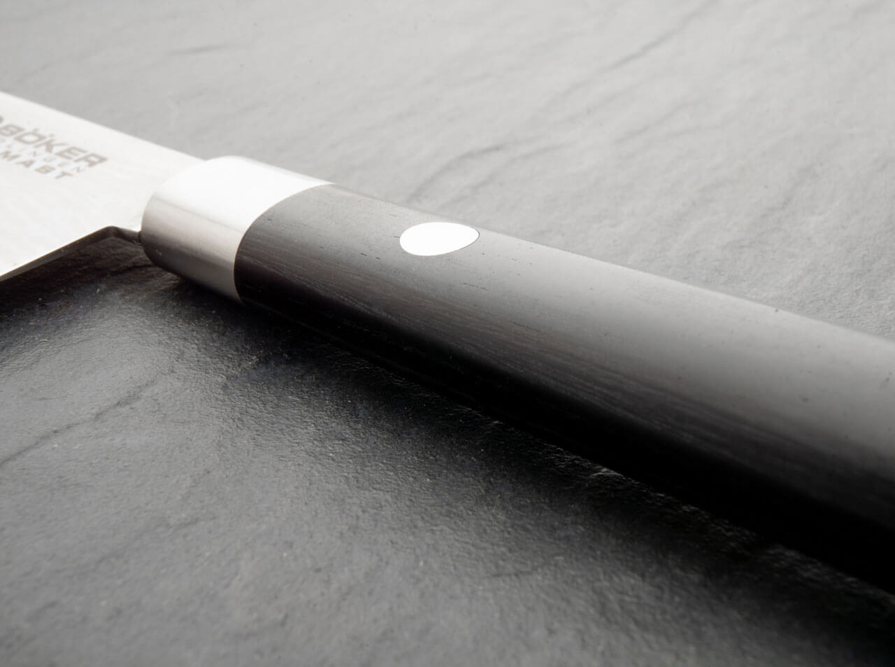 The Boker Damascus Black Kitchen Knife line combines traditionally-Japanese handles made of black Plywood with razor-sharp blades made of stainless Damascus with 37 layers of steel, characterized by a beautiful grain. The extremely high-impact core of the Damascus blade consists of the high-performance VG-10 steel. The noticeable sharpness when cutting is breathtaking and makes cooking an experience. The Japanese design of the knife handle with the matted stainless steel clamps gives the line its special character.