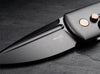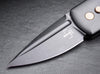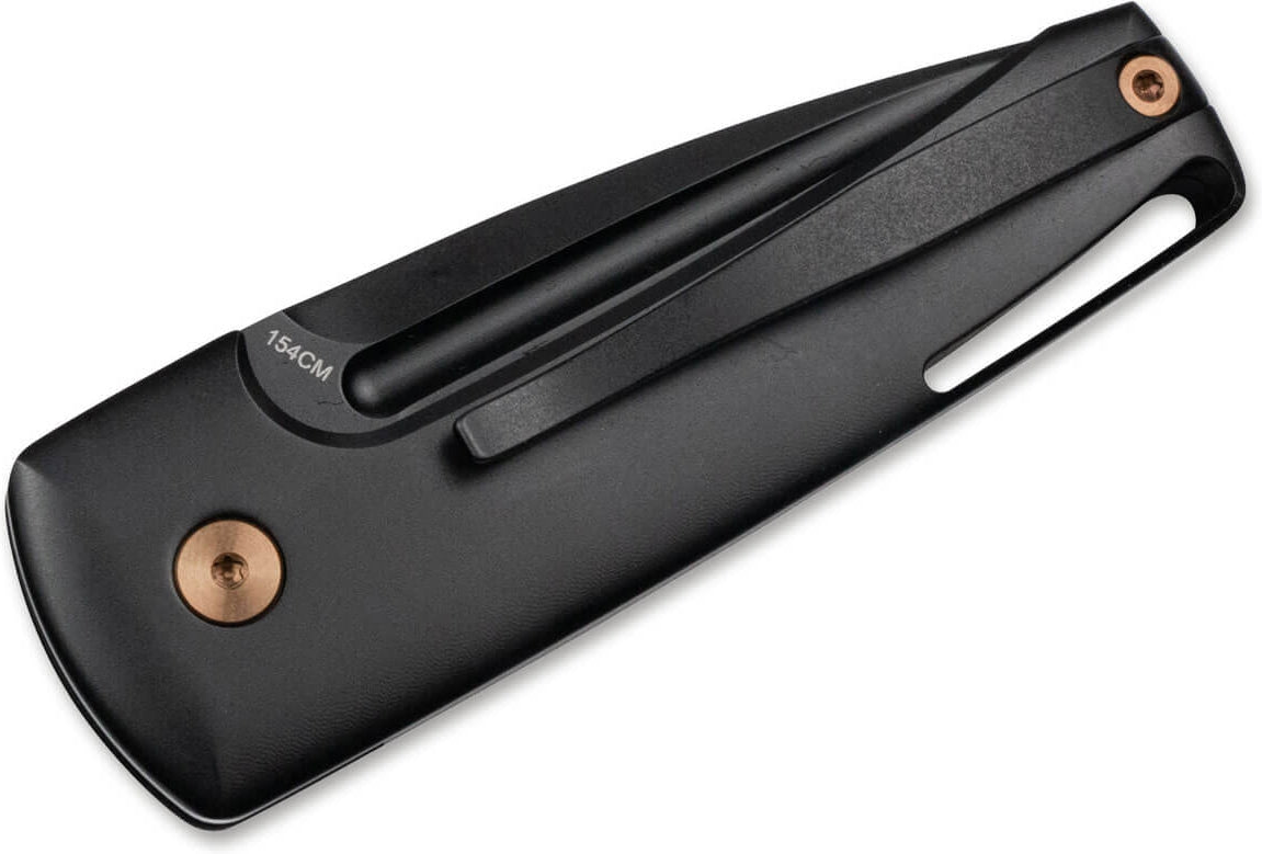 The Boker Plus Harlock Mini designed by Darriel Caston surprises as an extremely handy gentleman's automatic knife with an overall length of just under 12.5 centimetres. Known for his compact designs, the American custom knife maker always manages to present minimalist pocket knives with high utility value and perfect carrying comfort while going completely his own way. The slim Harlock Mini is a three-finger knife with an unusually shaped handle made of black-coated stainless steel. The 154CM blade, which is also coated, opens at the touch of a button and can be additionally locked with the help of the cleanly latching slide lock, preventing accidental release. It also has a decorative ricasso and a distinctive groove. The brass-coloured hardware gives the knife a particularly classy appearance with its very own look. Supplied with a wide lanyard hole, a practical clip (tip-up/r) and a high-quality nylon pouch for storage.