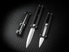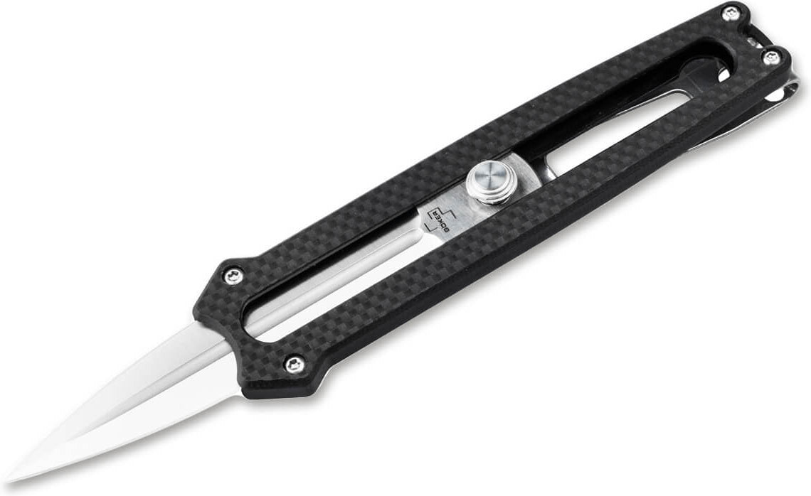 The innovative Boker Plus Slike is a lightweight dagger supplied with a D2 blade ground on both sides that is slid out of the handle frontally. Comparable to the mechanism of the widely used utility knives, the lock is released at a touch of the button and the satin-finished blade is then moved up or down manually. A detent at the halfway point further enhances work safety. It is supplied with a modern flat grind and a pronounced groove. The CNC-machined handle scales made of black G10 lie comfortably in the hand despite the pocket knife's small size. With lanyard hole, large-sized deep-carry clip (tip-down) and high-quality nylon case for storage.