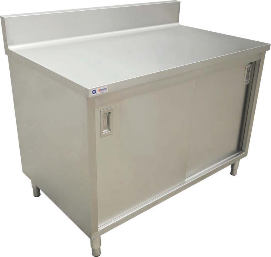 Work efficiently with this worktable with cabinet and 6" backsplash. Ideal for any commercial kitchen to help with food preparation in a busy, fast-paced setting. Featuring 430 stainless steel, this worktable has an enclosed cabinet with sliding doors and recessed handles to easily store kitchen equipment and other products in need.