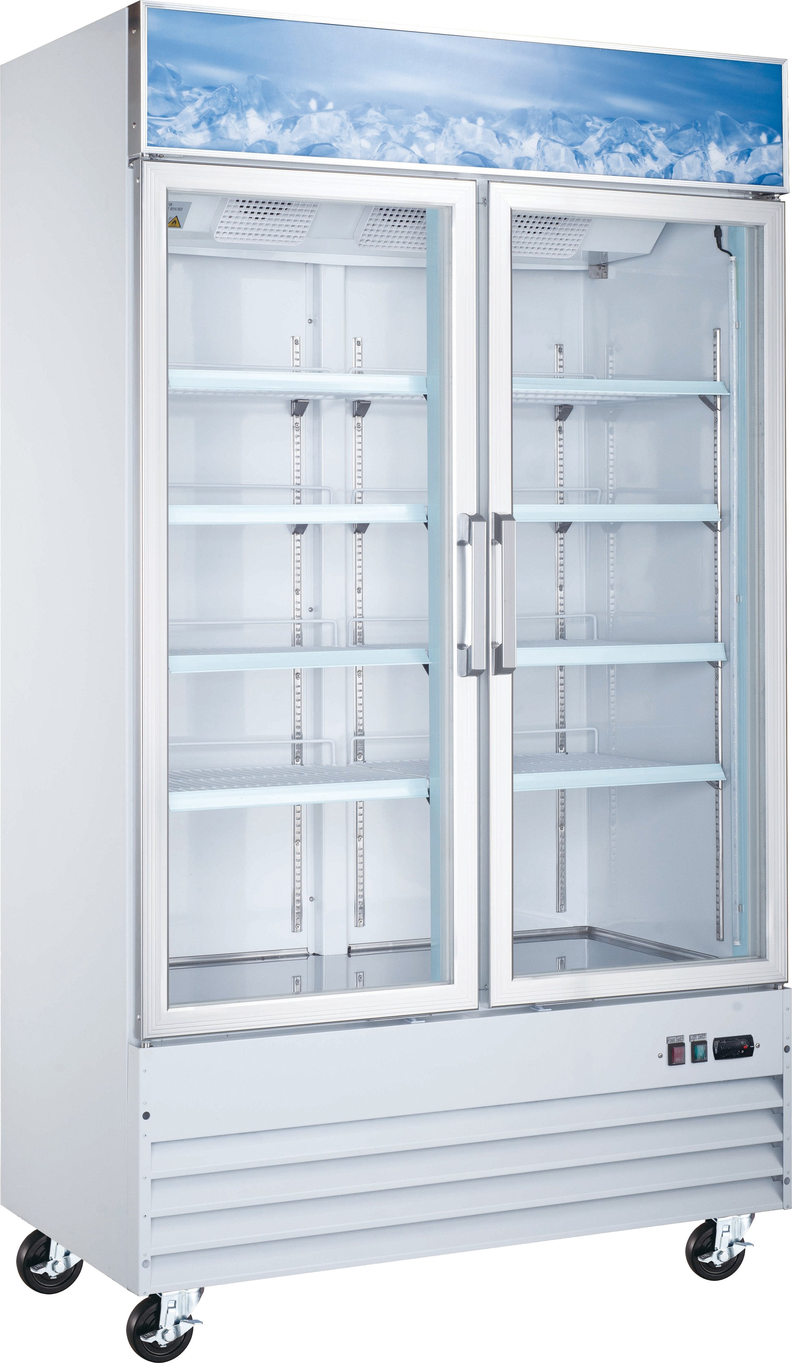 This dual glass door freezer features self closing glass doors and high density polyurethane insulation. With its sharp look and design, it also has plastic-coated steel shelves with shelf tag holder and removable door gasket. Automatic defrosting. 2 Years Parts and Labor and 5 Years Only on Compressor. Please note that this unit requires a 20-amp 'D'-type breaker.