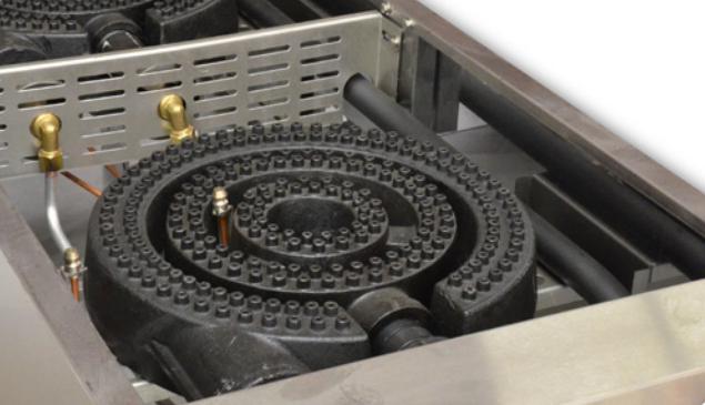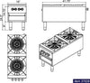 This stainless steel double stock pot range is equipped with flame out protector and cast iron burners with stainless steel drip pans. The smooth appearance and arc-shaped edge design make it easy to clean.