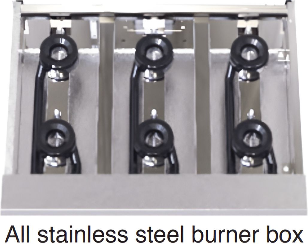 - Stainless steel front, sides, valve cover and kick plate including backguard and high shelf