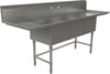 Sink, 3-compartment, 90"W x 27"D x 45"H overall size, (3) 18"W x 21" front-to-back x 13" deep compartments, 18" left & right drainboards, 10"H backsplash, (1) set of splash mount faucet holes with 8" centers, 1-1/2" diameter bullnose edge on front & sides, (3) 3-1/2" diameter center drains, includes (3) drain baskets, 18 gauge stainless steel construction, galvanized legs with side & rear bracing, adjustable bullet feet, cNSFus, KD. Actual item may differ from image.