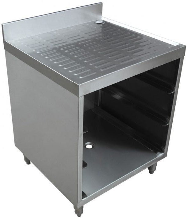 The unit features a smooth flat top, ideal for added workspace, and a 3-inch backsplash to protect surrounding walls. Its open-front design accommodates up to three full-size glass racks, keeping them easily accessible while ensuring they remain clean and in optimal condition. With adjustable feet and stainless steel legs, this glass rack storage unit provides stability and flexibility, making it an ideal addition to any commercial kitchen, bar, or catering setup.