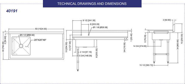 This under counter dish table/sink is made of polished 18-gauge stainless steel and comes with an 8-inch backsplash with a 2” return at 45º angle to minimize spills and splashes. The drain diameter is 3.5”. Comes with 26-inch stainless steel bullet feet legs with cross bracing.