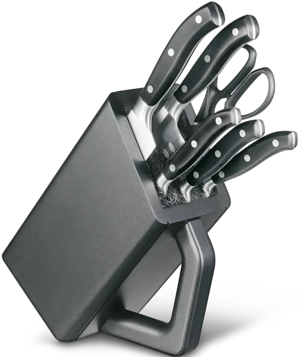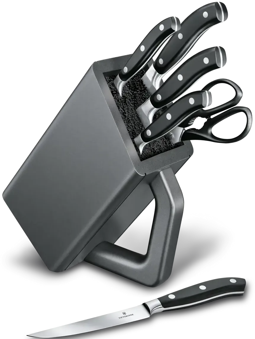 Exceptional quality and timeless elegance are two defining features of the Grand Maître series of forged knives from Victorinox. Each piece seamlessly transitions from blade to handle with a subtle thickening of the steel acting as a separating bolster, enhancing safety and comfort. This meticulously curated cutlery block includes five essential knives and multipurpose kitchen shears, making it a versatile choice for all but the most specialized kitchen tasks.