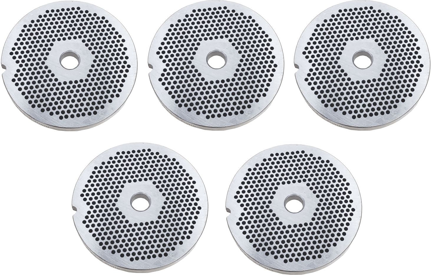The Omcan #32 (2.8 mm) Carbon Steel Hubless Meat Grinder Plate, Pack of 5, is a reliable and efficient choice for achieving finely ground meat with consistent quality, making it an essential tool for any meat processing setup.