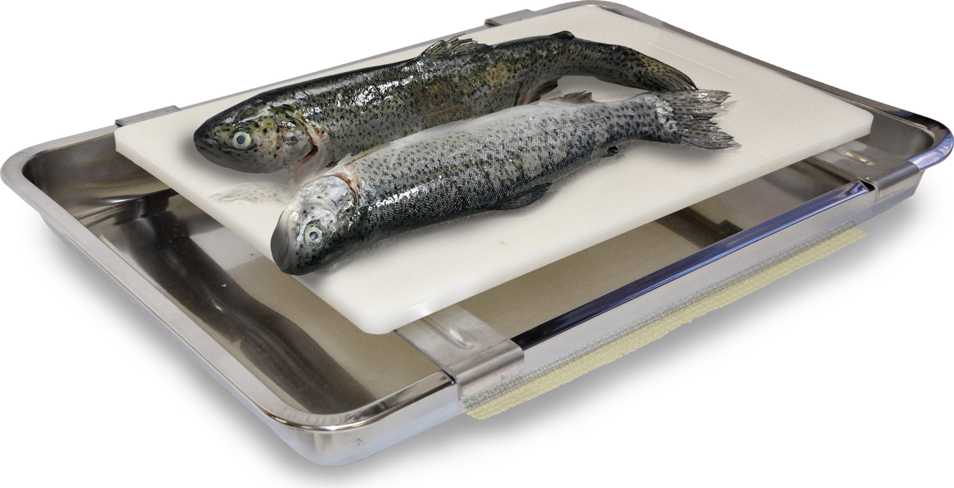 This polyethylene filet cutting board has a stainless steel drip pan.