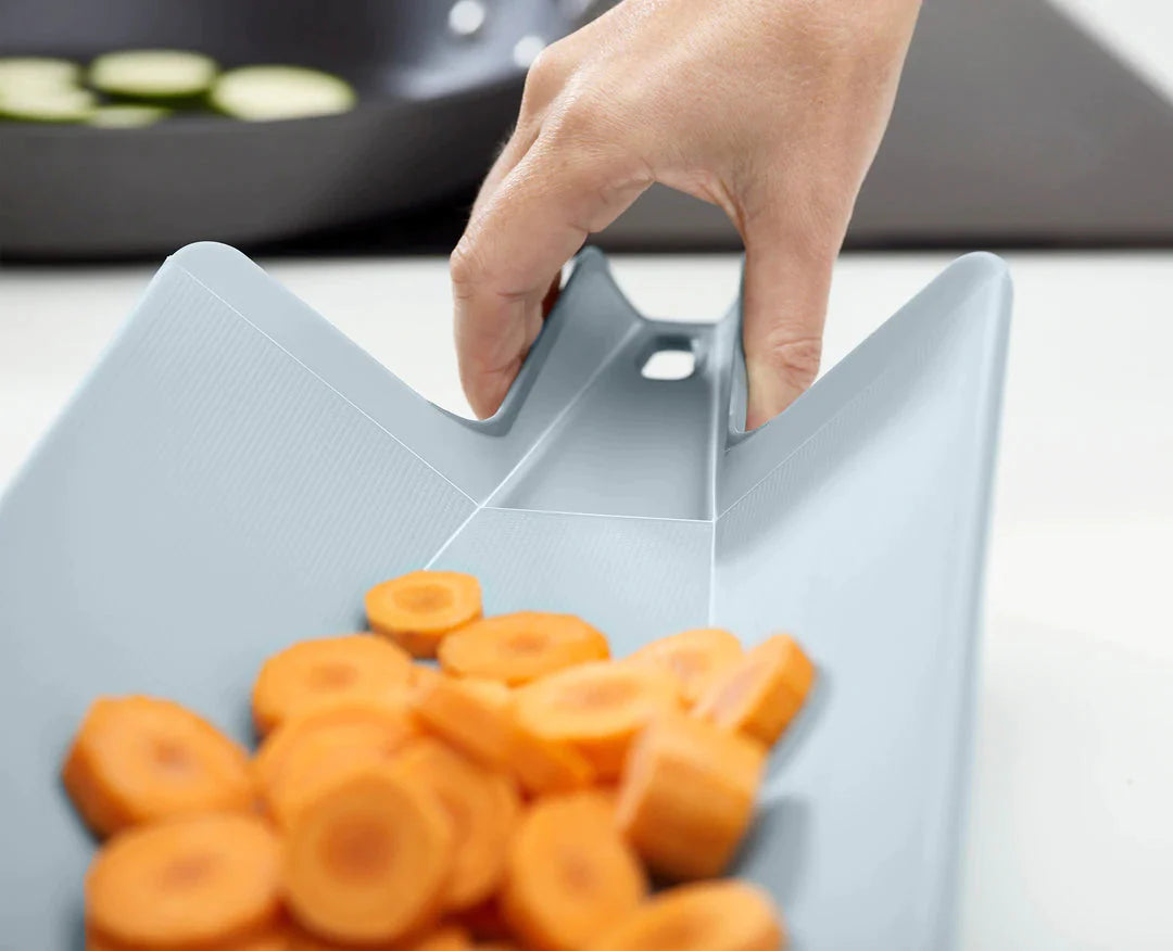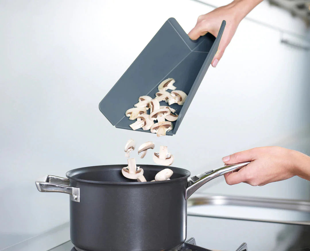 The original Award-winning folding chopping board. This set includes 2 different sizes of our clever folding chopping boards that allow you to transfer food without any spillages. Provides a durable, knife-friendly cutting surface. When the handle is squeezed, the sides of the board fold up forming a chute down which chopped food or waste can be neatly guided. Comfortable soft-grip handle and non-slip feet.