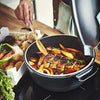 Our ‘Delight’ Braiser allows you to create delicious recipes, simmered or sautéed, with unparalleled ease on all types of heat sources (including induction), and in the oven. Developed using the latest technological resources, the “Delight” Braiser is very light for a ceramic dish and compatible with all types of heat sources (including induction). It offers the advantage of healthy cooking which respects the nutritional qualities of the ingredients used. The even heat distribution throughout the ceramic is ideal for enhancing the flavours while simmering, very gently, without burning… The dimples on the underside of the lid concentrate the evaporated juices, which fall back onto the ingredients in tiny droplets, ensuring that the recipe remains moist and full of flavour. With generous curves and a black satin finish, the “Delight” Braiser will enhance all recipes both family and exotic recipes when served directly on the table. Our ceramic is naturally non-stick and easy to clean. Handmade and carefully checked in our workshops in Burgundy, the Braiser is guaranteed for 5 years..