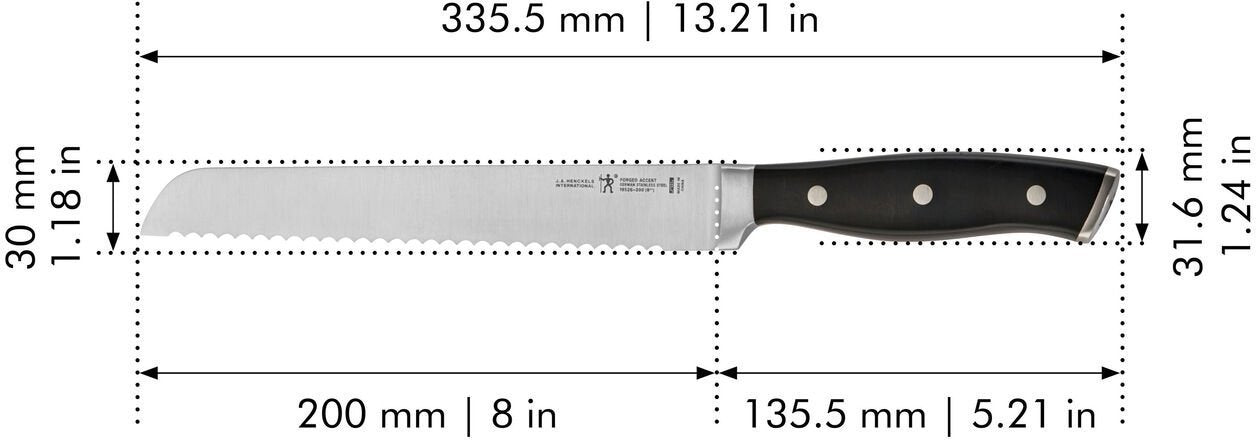 The FORGED ACCENT knife series is the definitive choice of hobby chefs seeking quality cutting performance and traditional style. Precision forged from high quality Stainless Steel, these blades have been tempered then honed for lasting sharpness. A full bolster provides added weight for perfect balance and the stylish three-rivet handles ensure a comfortable grip for easy cutting. Created in 1895 by Zwilling J.A. Henckels, this value-driven brand guarantees the same durability, design and ease of use for which the global company is known. Equip your kitchen with expertise with Henckels.