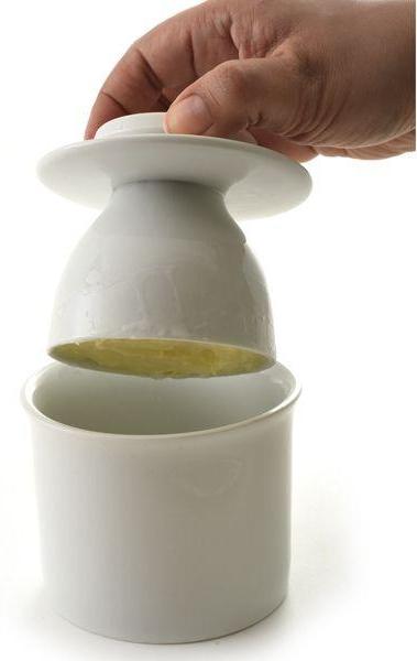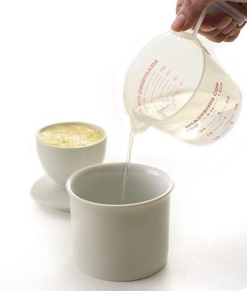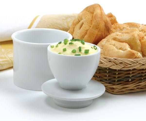 A butter lover's dream! Once you start using this Butter Keeper, you won't settle for hard butter again! Holding up to 1 stick of butter, the water in the base seals out air to keep the butter soft, sweet and spreadable for up to 30 days - without refrigeration! Simply pour approximately 1/2" / 1.25cm of water in the basin, fill the top of the butter keeper with butter, turn it upside down so the water is covering the top of the butter, and PRESTO! Soft, sweet, spreadable butter that stays fresh. (Water should be changed every 2-3 days). Made of attractive white porcelain. Attractive enough for your dining table or kitchen counter top! Helpful tip: Allow the stick of butter to soften first, then pack the butter into the lid. Hand wash for best results.