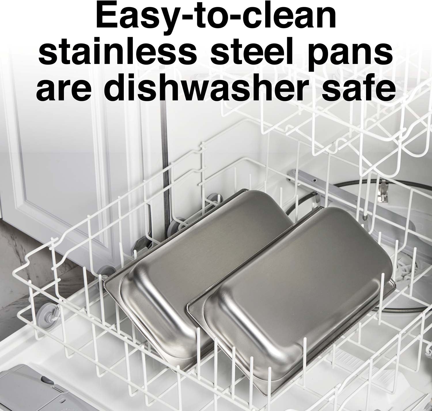 - Dishwasher Safe: The stainless steel pans are dishwasher safe for easy cleanup after use, while the domed lids can be wiped clean or rinsed in the sink.