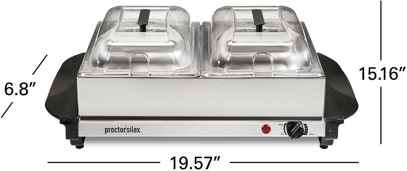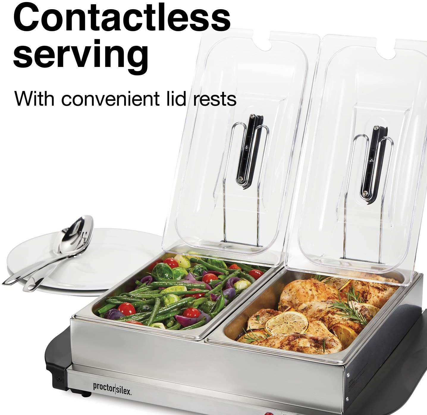 The Proctor Silex Double Buffet Server provides versatile serving options for keeping food warm during gatherings and special occasions. Featuring two oven-safe chafing pans with transparent domed lids, this buffet server ensures your dishes stay warm and ready to serve with adjustable heat settings and convenient lid rests for contactless serving. The Proctor Silex Double Buffet Server with Domed Lids offers exceptional versatility and convenience for serving and keeping food warm during any occasion. Its durable construction, adjustable heat settings, and easy-to-clean design make it an excellent choice for enhancing the serving experience with practical features like contactless serving and dishwasher-safe components.