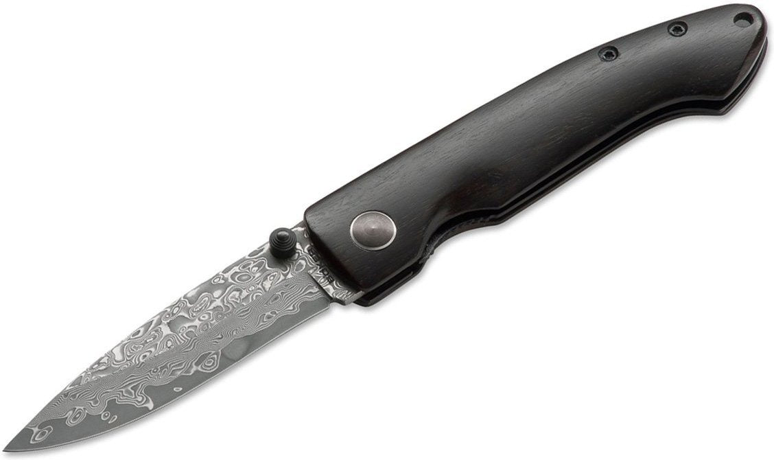 The Boker Plus Damascus Gent II is a classy gentleman´s knife with just one steel liner. The extremely light and slim design is comfortable to carry. The dark ebony and attractively grained Damascus blade with 67 layers creates a simple, yet stunning, elegance. The smaller version offers even more comfort but has the same, exclusive features. The blade is Locked by a Linerlock. With removable clip (tip-down).