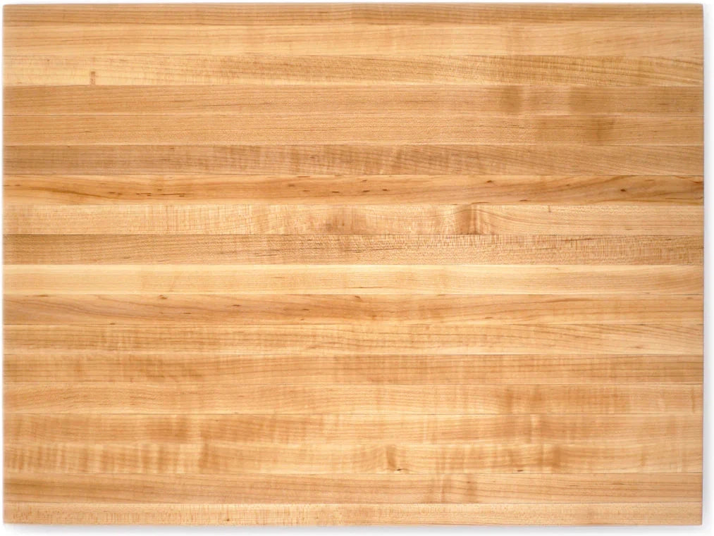 The smooth and seamless surface of the cutting board is ideal for cutting and chopping a wide range of ingredients. The fine grain of the maple wood creates a non-porous surface that resists moisture absorption and prevents food particles from getting trapped, making it hygienic and easy to clean. Additionally, the natural antibacterial properties of maple wood help inhibit the growth of bacteria, ensuring a safe and sanitary food preparation environment. The generous thickness of the cutting board adds to its durability and stability. The 1.5-inch thickness provides a solid and substantial feel, allowing you to cut and chop with confidence without worrying about the board flexing or bending. This thickness also helps protect your countertops and knives by providing a cushioned surface that absorbs impact and reduces wear and tear. Versatility is another key feature of this cutting board. Its large size and sturdy construction make it suitable for a wide range of kitchen tasks, including slicing, dicing, mincing, and more. Whether you're preparing ingredients for a family meal or hosting a dinner party, this cutting board can handle whatever you throw at it with ease.