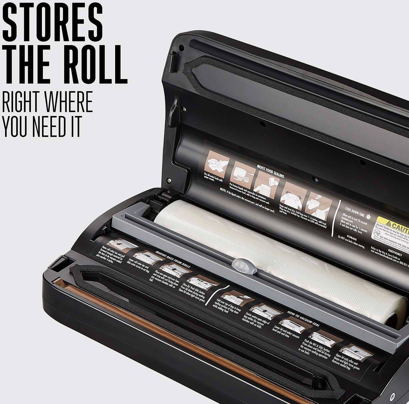 Roll storage is built into the vacuum sealer, so you always have a roll on hand when you need to make a bag. The lid locks into place to keep vacuum sealer rolls clean.