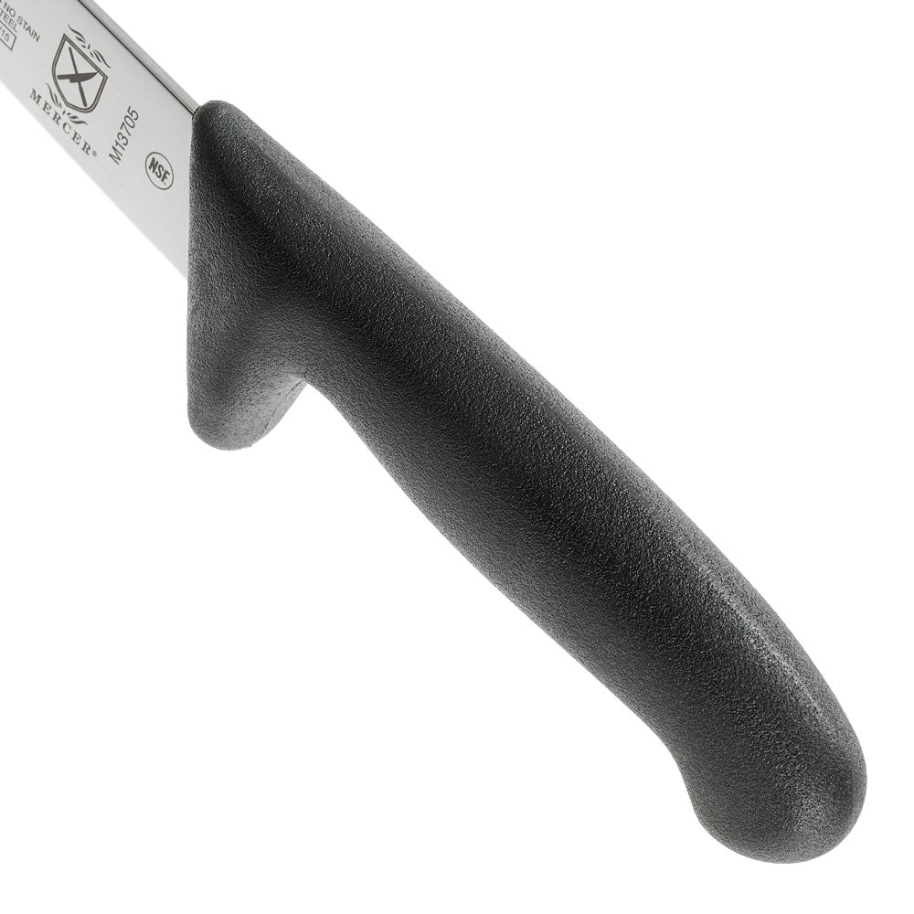 The Mercer - BPX® 8.25" German Steel Sticking/Flank Knife with Black Handle, designed to elevate your culinary experience to new heights. Crafted from high-carbon German steel, this knife embodies precision and durability for professional and home chefs alike. The steel undergoes an ice-hardening process, enhancing its strength and resilience to ensure longevity in your kitchen arsenal. Its mirror-finished blade not only exudes elegance but also facilitates smooth cutting and effortless food release, making every slicing task a breeze. Ergonomics meet functionality with the textured, ergonomic glass-reinforced nylon handle, providing a secure grip and unparalleled durability, even in the busiest of kitchen environments. The taper-ground edge maintains long-lasting sharpness, reducing the need for frequent sharpening, while also allowing for easy honing when necessary. Safety is paramount, and the Mercer - BPX® knife includes a protective finger guard, offering added peace of mind during intricate cutting tasks. Elevate your culinary craftsmanship with the Mercer - BPX® 8.25" German Steel Sticking/Flank Knife with Black Handle – the ultimate tool for precision and performance in the kitchen.