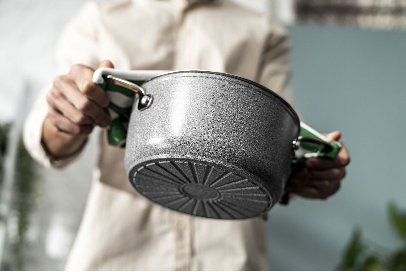 An absolute classic among cookware and your daily companion in the kitchen. The BALLARINI Salina 20 cm pot with glass lid both looks and performs fantastically. Its incredible chic granite design is by Studio Matteo Thun & Antonio Rodriguez. Whereas the pot’s incredible performance is thanks to its unbeatably scratch-resistant 6-ply GRANITIUM Ti-X non-stick coating and an extra layer of titanium. The pot is forged solid aluminium for rapid heating and is suitable for use on induction hobs. Its specially developed radiant induction technology ensures excellent heat distribution. After use, the pot is happy to go into the dishwasher and is perfectly dishwasher-safe. Today you’re in a rush but you still want to enjoy a really good meal? Then grab your 20 cm pot. It’s perfect for simple one-pot pasta dishes. Simply add garlic, onions and your favourite vegetables, lightly sauté, add the pasta and stock, and allow everything to cook.