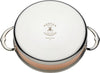 Beautiful and modern copper-stainless exterior. Durability of stainless steel surface and reinforced rims. Wrap-around induction base for enhanced strength and durability and optimized for induction efficiency.