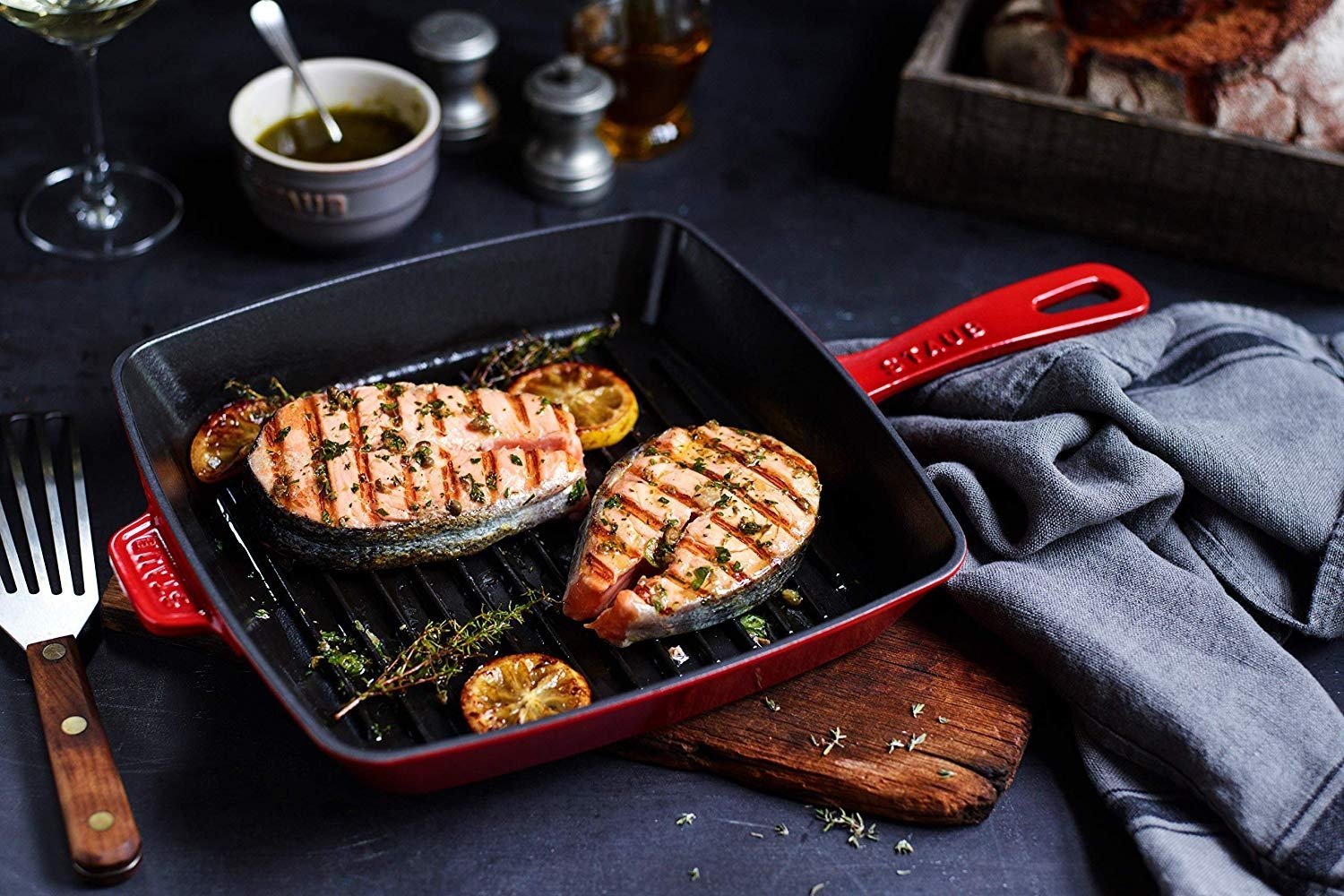 Canadians enjoy nothing better than a barbecue. There is hardly a meal that we won't barbecue to cook outdoors with family and friends. To barbecue a premium cut of meat, many experts recommend a grill pan. Staub's grill pan is a healthy way for you to fry or grill meat, fish and vegetables while retaining the characteristic barbecue aroma. The pan is square-shaped with a practical short handle. The cooking surface is ridged to give food that characteristic grilled look. The grill pan is made of cast iron and suitable for any heat source. It retains heat and then disperses it evenly during cooking. The pan is robust and scratch-resistant. With each use, its special features become increasingly evident. Staub's grill pan enables you to experience the typical atmosphere of a barbecue at home, and is also a stylish and versatile pan to add to your cookware collection.