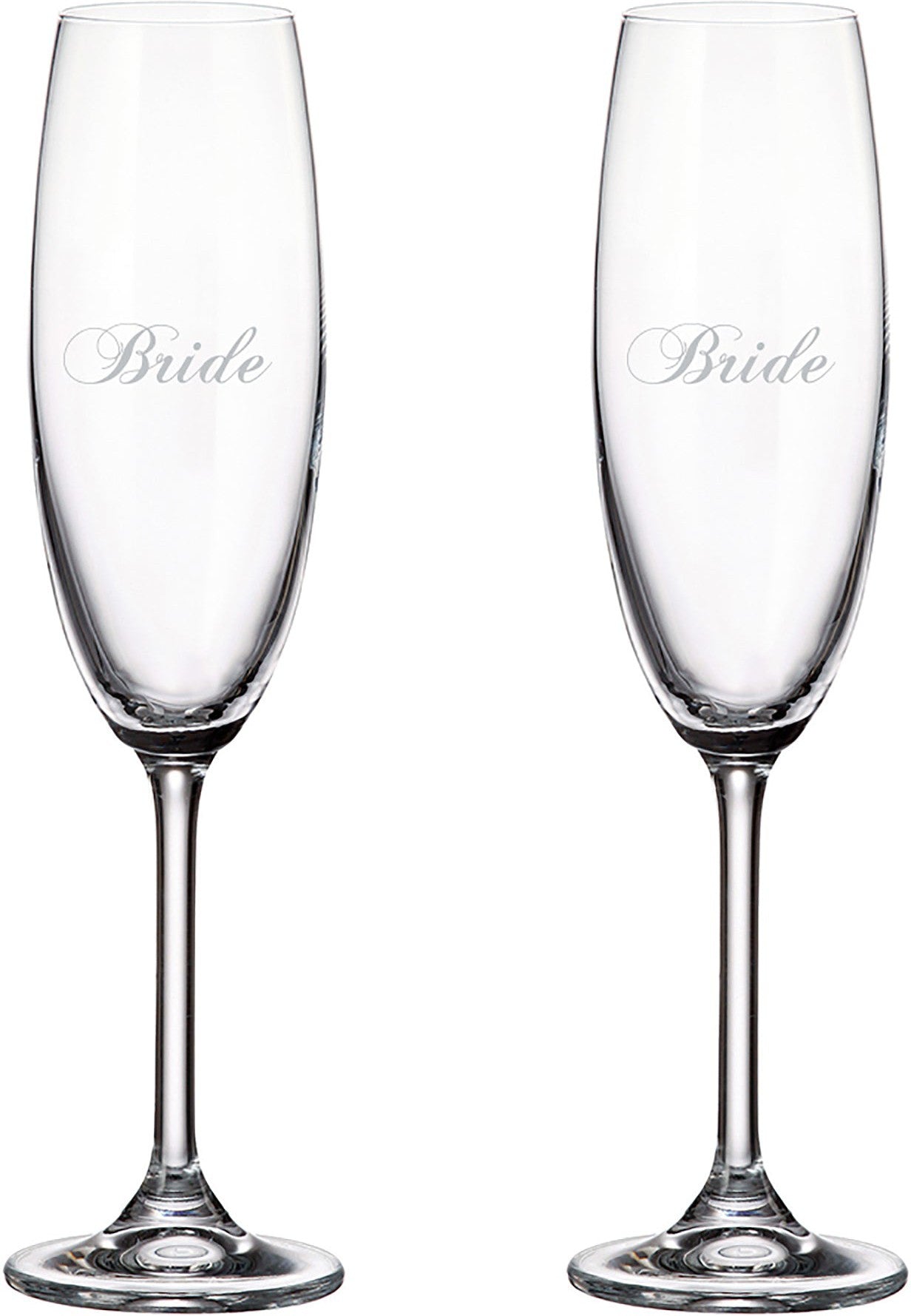 The Cuisivin Bride & Bride Champagne Flute Glasses, a perfect gift set symbolizing love and unity. Crafted with exquisite detail, these glasses are adorned with a frost printed "Bride & Bride" design, making them a charming addition to any celebration. Constructed from premium lead-free crystal, these flute glasses boast a fine rim, ensuring a luxurious drinking experience with every sip. Their sturdy build also makes them dishwasher safe, offering convenience without compromising elegance.