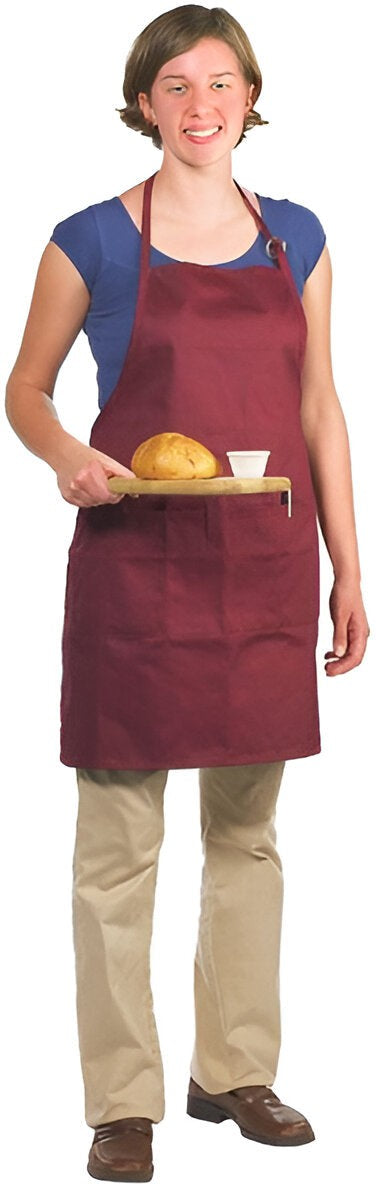 The Chef Revival 28" x 30" Poly-Cotton Utility Bib Apron with 3 Pockets & Adjustable Neckstrap is an essential addition to any professional kitchen or dining establishment. This full-length bib apron not only helps keep your staff's clothing protected from spills and stains but also enhances their professional appearance. The apron features a large three-compartment front pocket, ideal for carrying recipes, guest check presenters, labels, and other essentials. Designed to fit most individuals, it includes long ties and an adjustable neck strap to ensure a comfortable and secure fit. Made from a durable poly-cotton blend, this apron is both comfortable to wear and easy to clean. This utility bib apron combines practicality with a professional appearance, making it an excellent choice for both servers and kitchen staff.