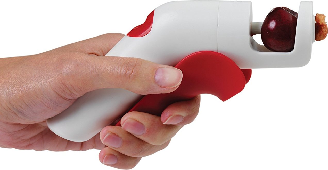 Stop biting down on hard cherry pits! This hand-held cherry pitter gets rid of cherry and olive pits in seconds. Just insert a cherry or olive into the nook, pull the trigger, and watch the pit pop right out! This gadget is perfect for kids since it does not require a blade.