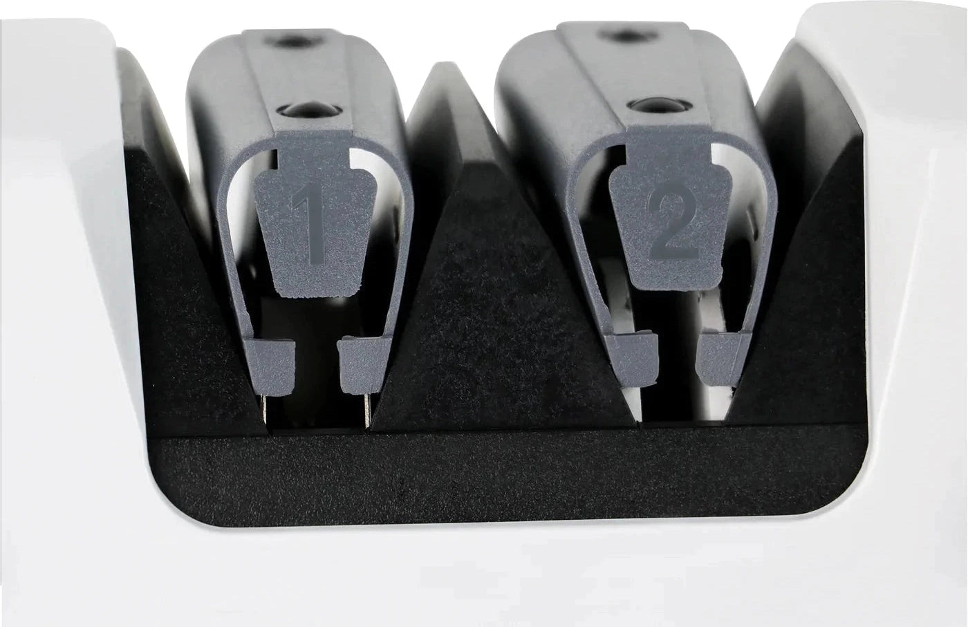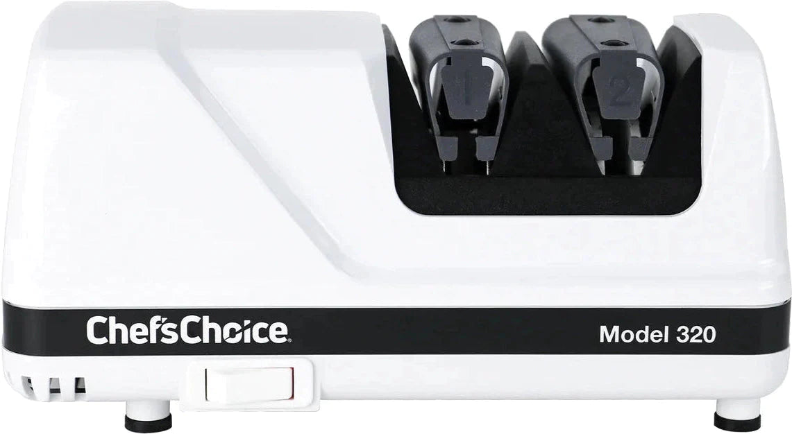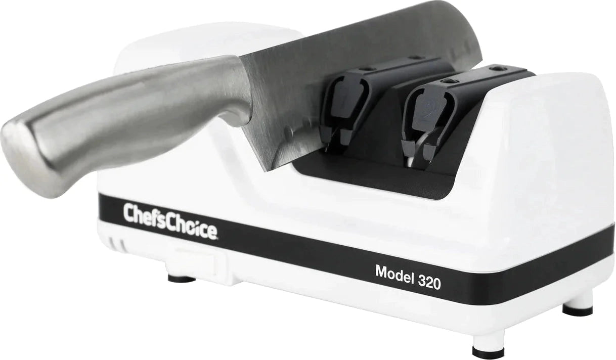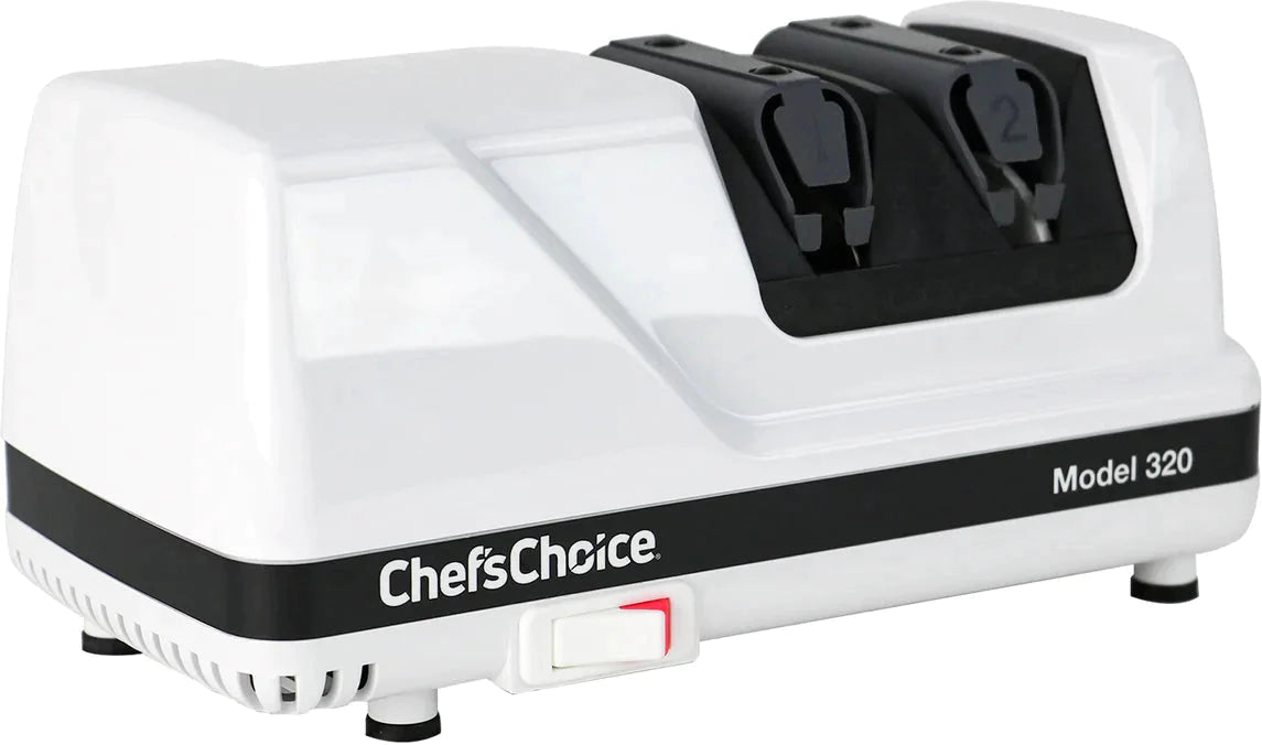 Ideal for 20° class straight edge and serrated knives, this 2-Stage sharpener features precision angle control and single-sided knife sharpening. The first-time sharpening takes approximately 1.5 minutes, while resharpening is a quick process of approximately 10 seconds. ETL approved for Canada, the Model 320 uses 100% diamond abrasives in Stage 1 and unique stropping and polishing disks in Stage 2, guaranteeing hairsplitting sharpness and highly durable edges.