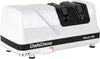 Discover the Chef's Choice Diamond Hone FlexHone/Strop Professional Knife Sharpener, a compact and lightning-fast electric sharpener that elevates both straight edge and serrated knives to better than factory edges, all within minutes. Using advanced technology, this professional sharpener offers 2-Stage sharpening, providing arch-shaped edges that are stronger and longer-lasting than hollow ground or conventional "V" edges. In Stage 1, 100% fine diamond abrasives create the first bevel, while Stage 2 ultra-hones the edge using advanced micron size 100% diamond abrasives to complete the second bevel.