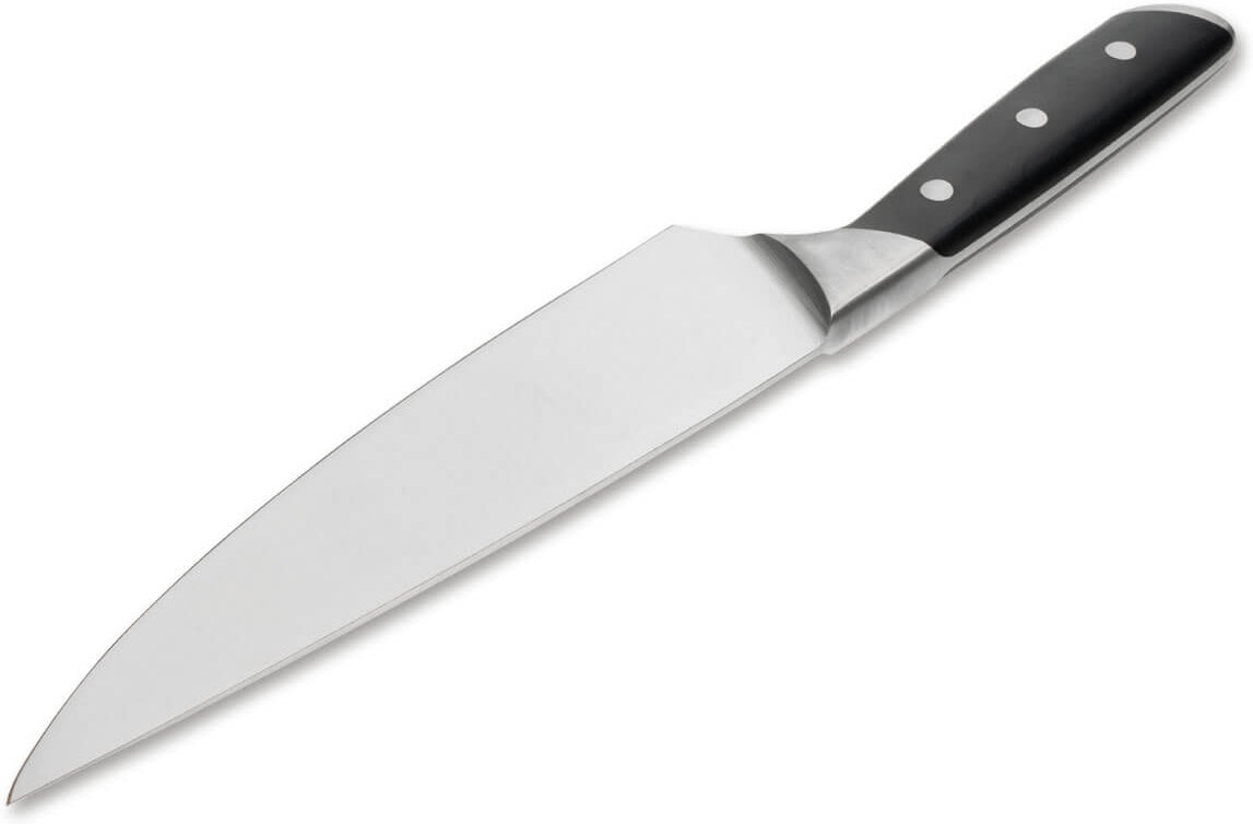 The Kitchen Knife line Boker Forge combines innovative and dynamic designs with a classic material selection, at a premium quality level. The attractive, eye-catching design lines distinguish this series significantly from the masses of average kitchen knives, without being too flashy. In addition, the Boker Forge series is convincing with a very attractive price-performance ratio. The knives are made from X50CrMoV15 chrome-molybdenum-vanadium stainless steel, are ideally balanced and provide perfect handling due to the ergonomic grip design. Black handle scales made of special high-quality ABS synthetic material are durably combined with three stainless steel rivets and are attached to the completely continuous tang without rivets. The design of the blades, including the transition to the bolster, allows easy sharpening and ensures long-term perfect function for the knives in combination with proper care. Please only hand wash the knives, do not place in dishwasher. Moreover, the Boker Forge series convinces with an incredibly attractive price-performance ratio. The knives are delivered in a high-quality gift box.