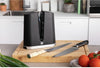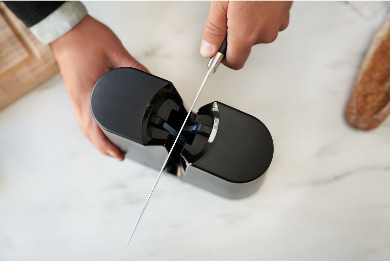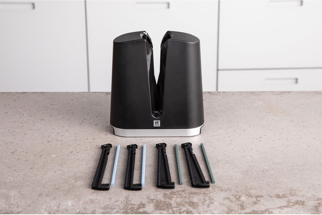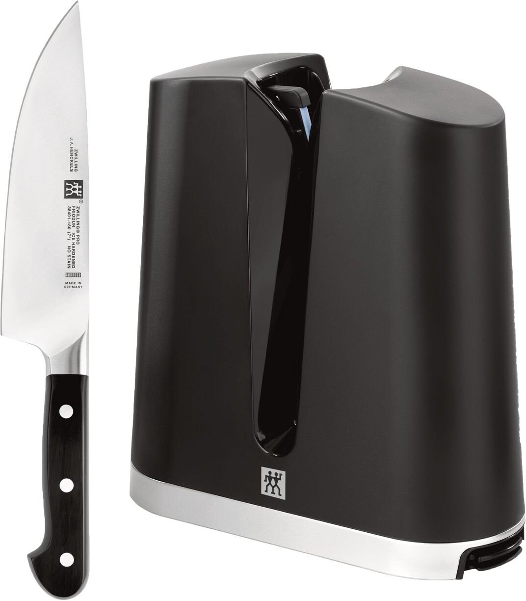 Never a dull knife again! It's time to sharpen like the professionals. Included in this set is a ZWILLING Pro 7" Chef Knife and ZWILLIN V Edge Sharpener. Anyone whose ever prepared food with a truly sharp knife knows the incredible experience of using one. However, even the best blades lose their edge over time. Regular sharpening is crucial for maintaining their quality over the long term. But before you reach for a whetstone or sharpening steel and spend hours online looking for instructions on how to sharpen a knife correctly, take a moment to read on. Its patented sharpening mechanism is incredibly simple and wholly effective. Simply pull the knifes blade at a diagonal from above in a downward direction and the V-Edge does the rest. The V-shape arranged ceramic sharpening stones evenly sharpen the entire length of the blade without the risk of damaging it. Different angle adapters are included for European (like the ZWILLING PRO Chef Knife) and Japanese knives. A lot of work has also been put into the exceptional design and premium workmanship of the V-Edge to make sure you see at first glance just how good it is. Instead of hiding it away in the cupboard, simply place it on the kitchen counter and leave the fine grain sharpening stones installed. That way, you can simply pull your knives through the V-Edge a couple of times before each use. Your knives will retain their professional sharpness and youll enjoy cooking with them even more.