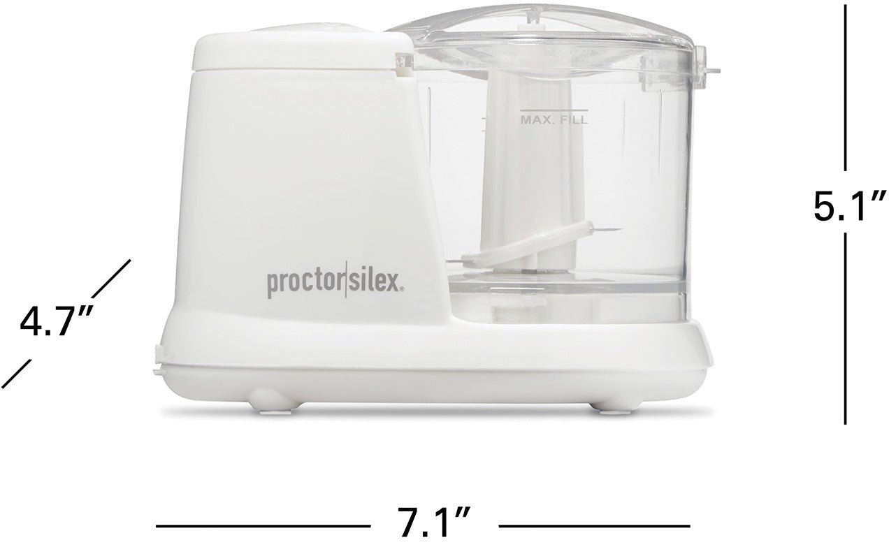 The Proctor Silex® 1.5 Cup Food Chopper is designed to handle everyday food prep tasks with ease. Compact and efficient, it's perfect for chopping, pureeing, and emulsifying small quantities of food, making it an essential kitchen tool for quick and simple food preparation. The Proctor Silex 1.5 Cup Food Chopper is a versatile and compact kitchen tool, perfect for everyday use. Its efficient stainless steel blades and pulse speed control allow for precise chopping, pureeing, and emulsifying, making it ideal for a variety of food prep tasks. The compact design saves space, while the dishwasher-safe components make cleanup a breeze. With a 3 year limited warranty, this food chopper is a durable and reliable addition to any kitchen.
