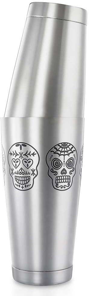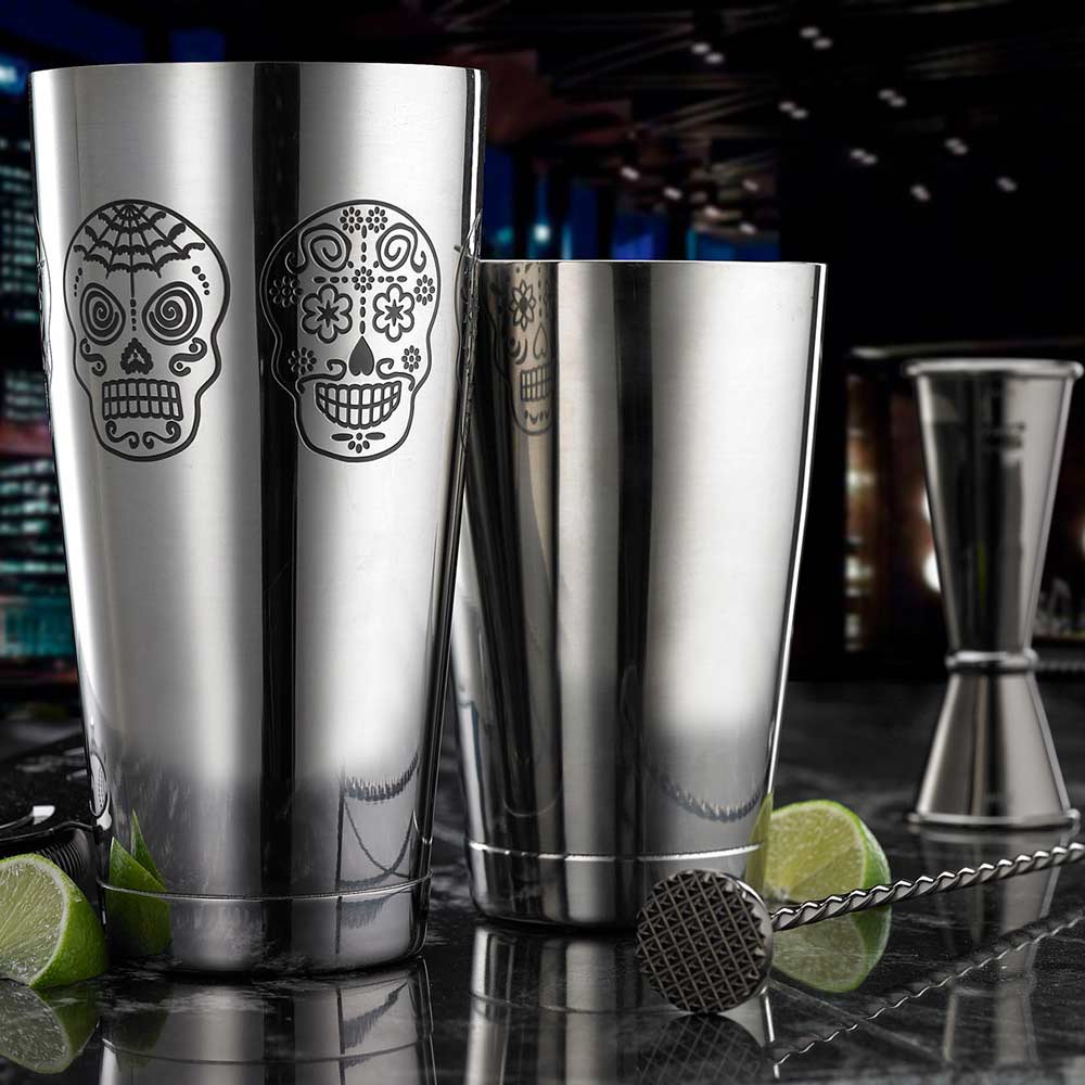 Craft your most creative and popular cocktails with this Barfly 28 oz. & 18 oz. stainless steel skull 2-piece cocktail shaker. An ideal addition to any mixologist's arsenal, this shaker stainless steel set allows you to mix and chill cocktails prior to serving. It comes with a small, 18 oz. and large, 28 oz. shaker tin that fit together perfectly, providing you with a way to effectively mix liquids, ingredients, and ice. If you're using them individually, each shaker tin is designed to accommodate a mixing glass. The intricate sugar skull design adds flair to any bar and is perfect for Mexican restaurants, themed bars, or Halloween events. Use this set to concoct anything from specialty martinis and mojitos to classics like long island iced teas, whiskey sours, and screwdrivers. Thanks to an 18/8 stainless steel construction, this stylish shaker set provides superior strength and sanitation. While each shaker's capped bottom offers additional durability for long-lasting use, the satin interior finish hides wear and tear to maintain a professional appearance. This set is sure to be an essential, go-to tool for bartenders at trendy bars and restaurants.