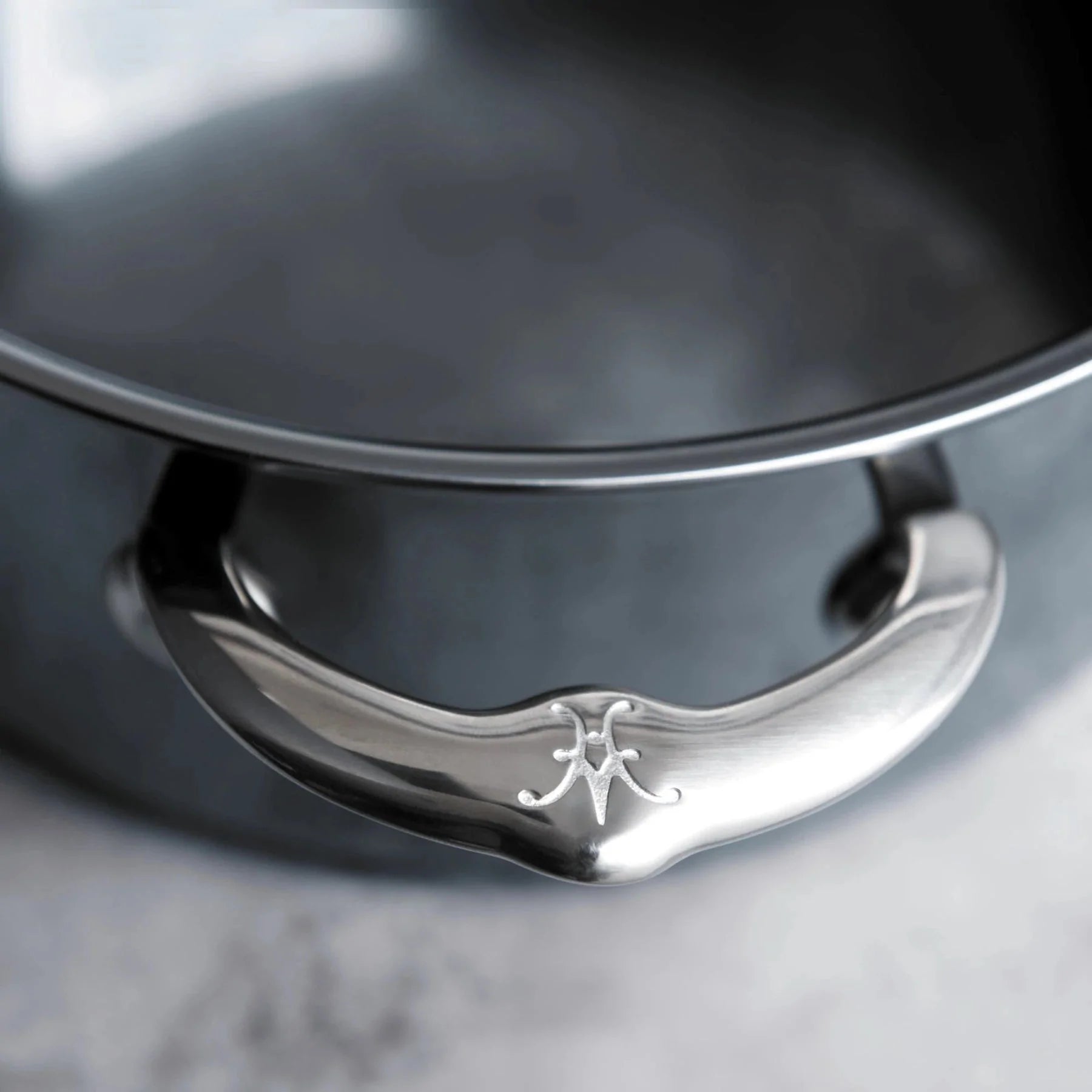 The flush rivets on the interior and exterior not only make your cookware easy to clean, this design also allows the cookware to stack and store more easily. The ergonomic handle design is ideally weighted and becomes a natural extension without strain and won't turn in your hand. The Hestan crest is proudly displayed on each handle.