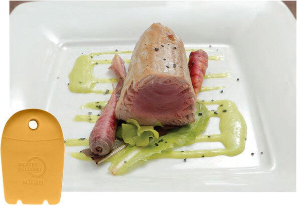 The Mercer 3.75" X 2.5" Silicone Plating Wedge with 0.15" Horseshoe Arch, a versatile tool designed for culinary perfection. Crafted with precision and innovation, this plating wedge is a must-have for every chef's toolkit. Elevate your plating game with its color-coded design, ensuring easy identification amidst the hustle of the kitchen. Made from food-safe silicone, it boasts heat resistance up to 480°F (250°C), offering durability and peace of mind during intense cooking sessions. Designed for comfort and precision, this plating wedge features a recessed thumb rest, allowing for a comfortable grip and enhanced control over delicate plating maneuvers. With a generous width of 2 1/4", it facilitates broad patterns on plates or platters, enabling chefs to showcase their culinary creations with finesse. For added convenience, it comes with a convenient hanging hole, allowing for easy storage and access in busy kitchen environments. And when the culinary masterpiece is complete, rest assured knowing that this plating wedge is dishwasher safe, ensuring effortless cleanup and maintenance. Experience the perfect fusion of functionality, durability, and style with the Mercer 3.75" X 2.5" Silicone Plating Wedge with 0.15" Horseshoe Arch – your ultimate companion in the pursuit of culinary excellence.