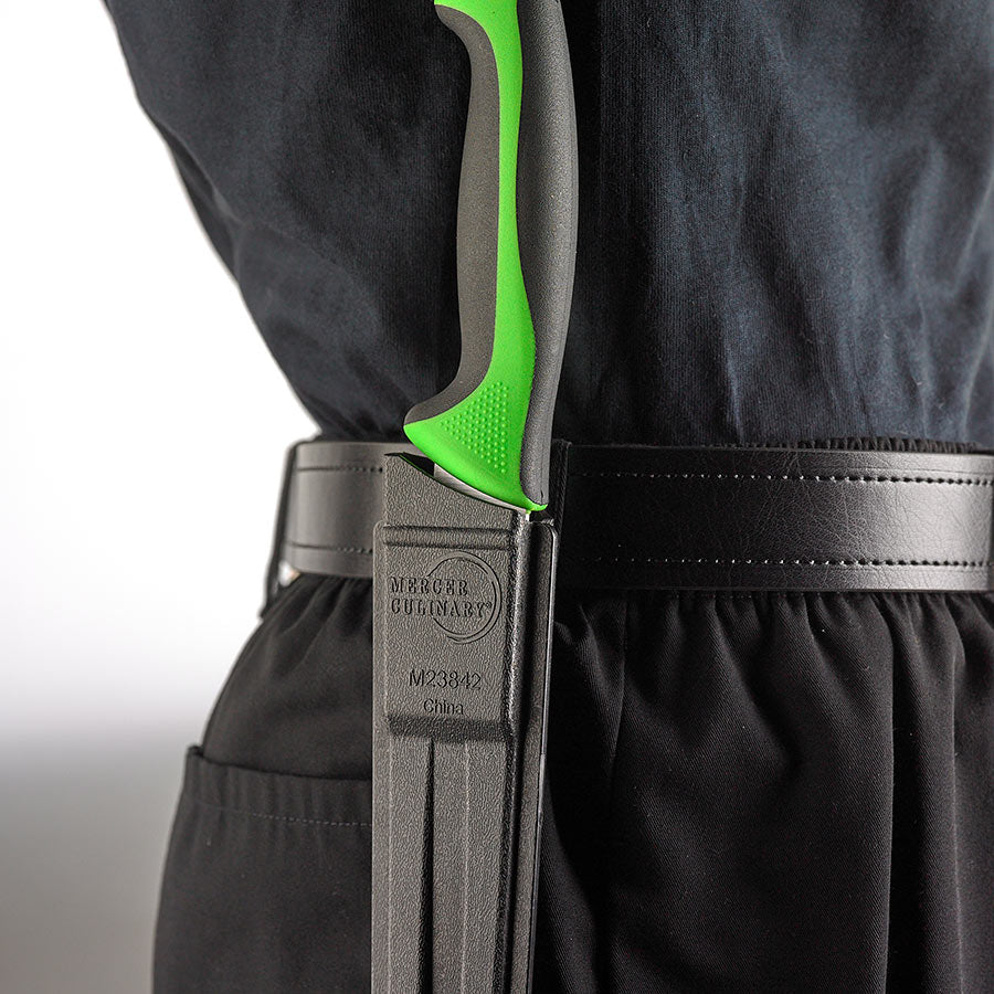 Featuring a convenient metal spring clip, this sheath offers versatility, allowing you to attach it effortlessly to belts or pants pockets for easy access while on the go. Whether you're a professional chef in a bustling kitchen or a home cook prepping meals, this sheath provides the practicality and reliability you need to keep your knife within reach at all times. Upgrade your knife's storage solution with the Mercer Polypropylene Black Plastic Sheath and experience enhanced convenience and peace of mind with every slice.