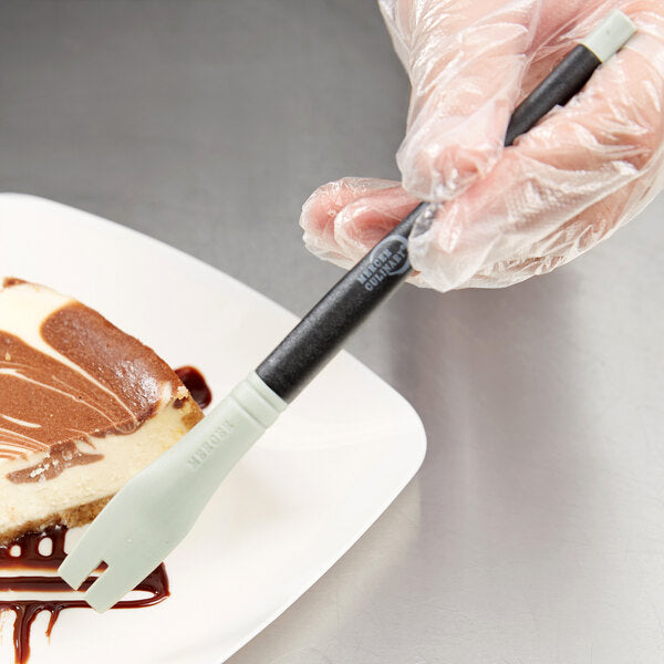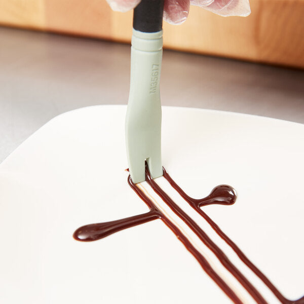 The Mercer - 7.6" Silicone Gray Square Notch Plating Brush, your ultimate kitchen companion for precise and effortless plating! This innovative tool is designed with meticulous attention to detail, ensuring optimal performance and ease of use in professional and home kitchens alike. Featuring a color-coded brush head and tip, this plating brush allows for quick and easy identification of the brush style, streamlining your workflow and enhancing efficiency. Crafted from 480°F (250°C) food-safe silicone, the brush head boasts exceptional flexibility, maintaining perfect contact with the plate for impeccable presentation every time. Equipped with a high-temperature nylon handle, this plating brush offers durability and heat resistance, making it ideal for use in high-temperature environments. The handle is thoughtfully tapered to accommodate multiple gripping positions, providing versatility and comfort during extended use. Additionally, its textured surface ensures a secure grip, enhancing control and precision. Say goodbye to tedious handwashing – this plating brush is dishwasher safe, simplifying cleanup and maintenance. Elevate your plating game with the Mercer - 7.6" Silicone Gray Square Notch Plating Brush, the indispensable tool for achieving professional-quality presentations with ease and finesse.